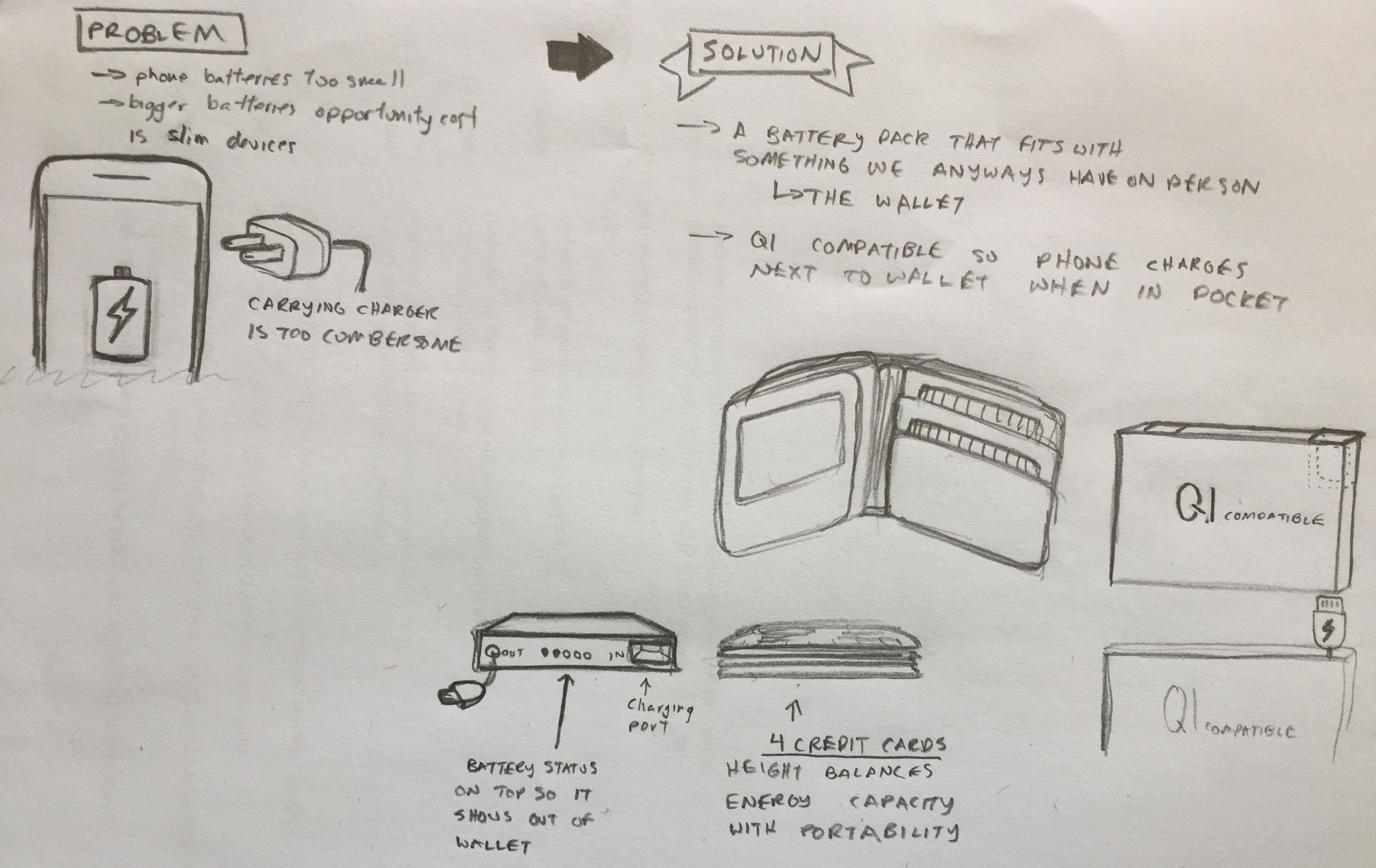 What makes this concept effective is that it fits in something most people carry around with them all the time: their wallet. By placing this battery into one of the slots, it doesn’t require the user to carry around extra gadgets or change their daily behavior. It blends into daily life, and no significant bulkiness is added; something present on most unwieldy battery cases. All controls and displays are also on the top edge of the battery so they can be accessed and glanced at without having to open up the wallet entirely. Finally, I did some research on wireless charging and found suppliers able to produce QI compatible batteries capable of charging from distances of up to 3 inches. Essentially, this means if the wallet and a QI compatible handset are next to each other, the battery can wirelessly charge the device. This translates to effortless charging while the phone is even in the pocket.