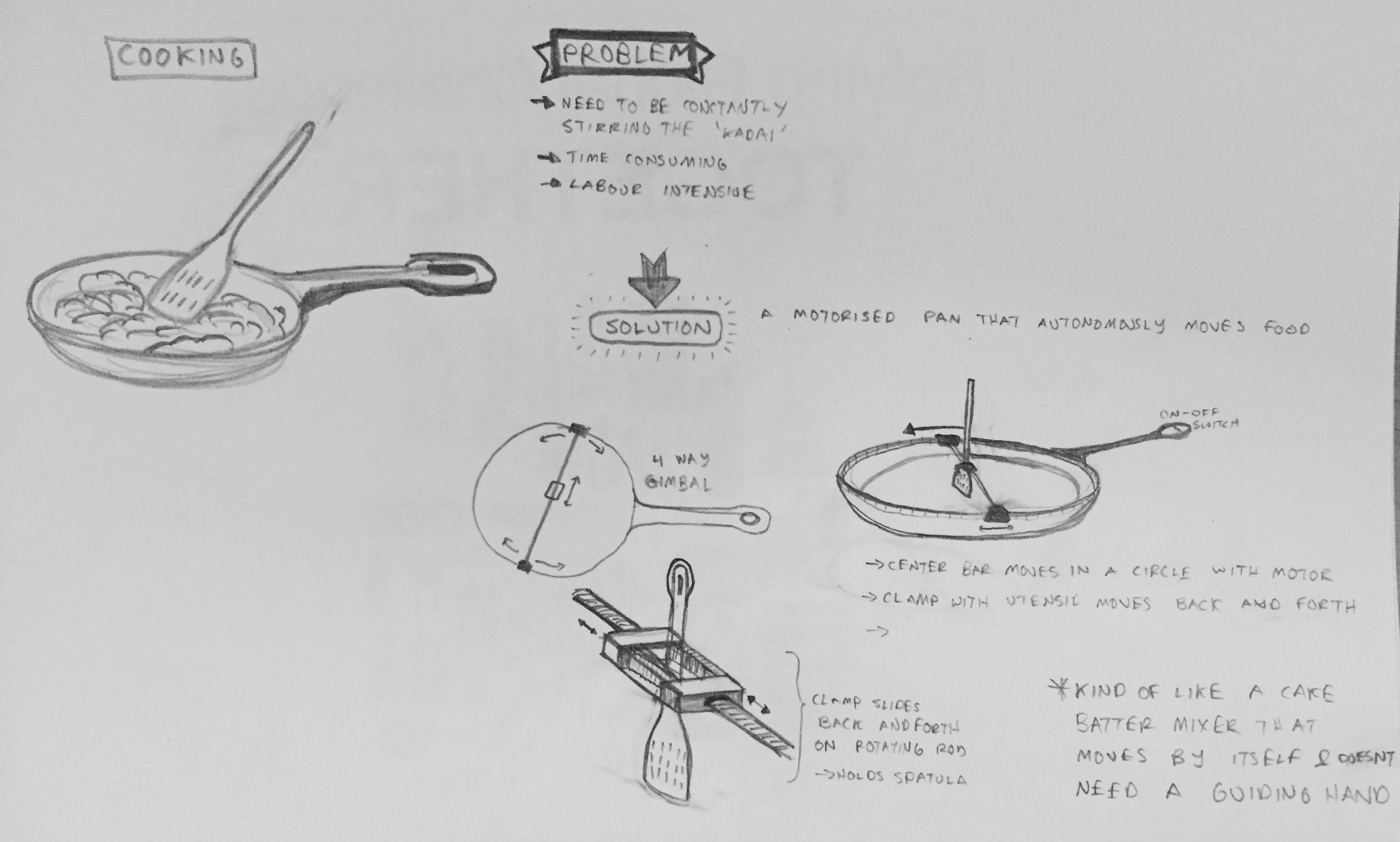 I was sitting in the kitchen, waiting for my favorite food “Kadai Paneer” to be made. As I sat on the side, I noticed how the process was comprised of the most part by constantly having to stir the pot/pan. There was no shaking, no tossing, just a slight movement of the spatula that could be mimicked by a simple mechanism. I thought it would be fun to design such a thing that would free up time in the kitchen, and make cooking easier at the same time. What I envisioned was a mechanism that could be adjusted to fit on the edge of the pot, and the slow, laborious process can be relegated to this simple motor.