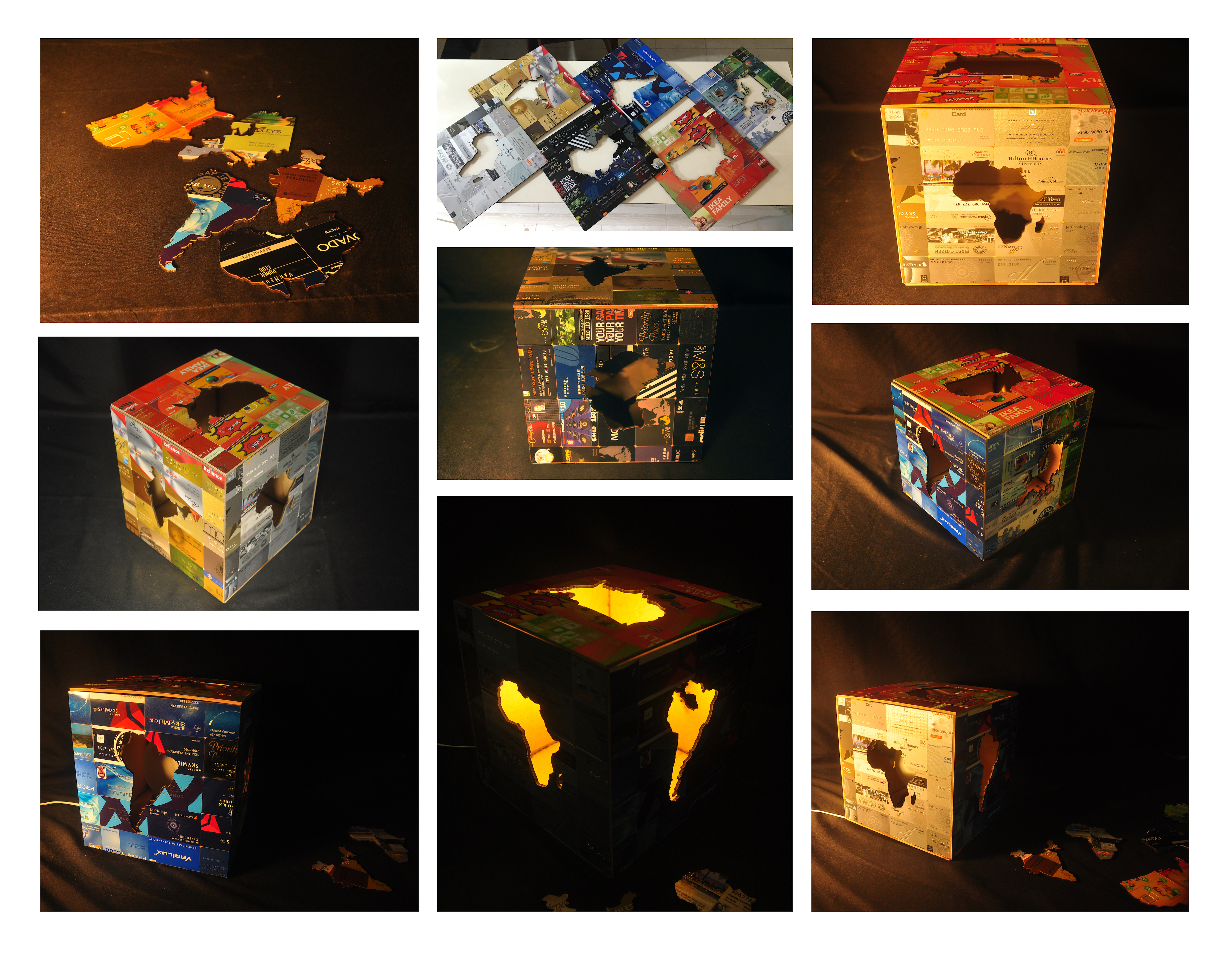 This piece was a chance for me to experiment with laser cutting technology. Although laser cutters are typically used to cut wood or acrylic, I attempted to use the machine to cut credit cards that I had glued onto wooden boards. Here is the finished product:
