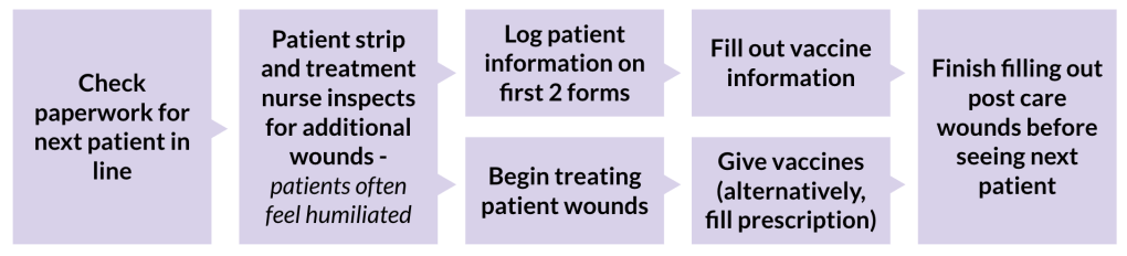 By learning how small-scale elderly health facilities function, we quickly began to understand that bottlenecks arise in the first step of the process: the visit with the treatment nurses. When a patient comes in, treatment nurses are the first ones that look them over and check for any bruises, scars or wounds. With each wound they find, they have to fill out 7 forms (if someone comes in with 7 wounds, that means 49 pieces of paperwork). In fact, they spend a minimum of 1.5 hours a day just filling out paperwork. The paperwork burden placed on treatment nurses shifts the focus away from patients and buried patient information leads to neglect in care.