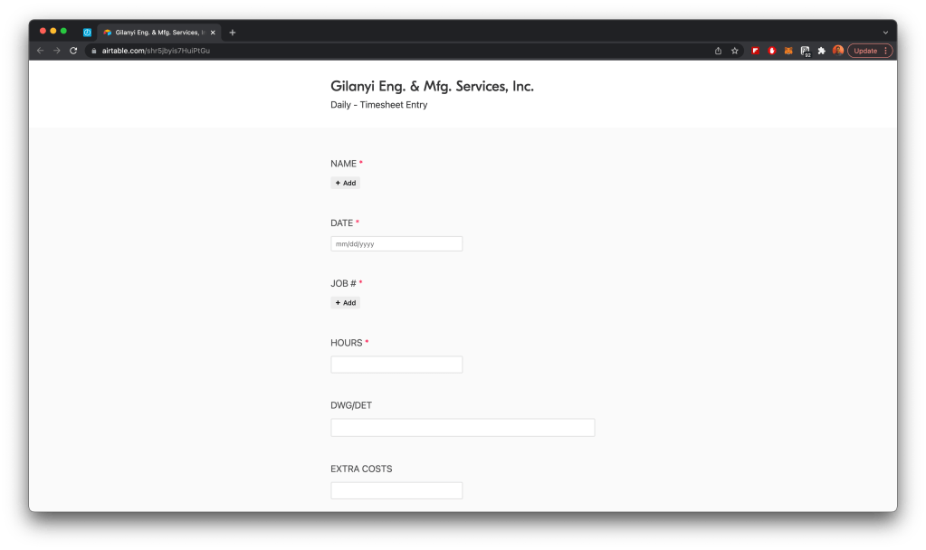 Overview: I built a custom time tracking payroll software using Airtable+Zapier for the GEMS factory in Ohio, helping them avoid over $30k worth in development fees they were considering in order to build a bespoke app. The app is currently used by the admin team and saves over 2 hours/day + countless errors in manual transcription that add up.