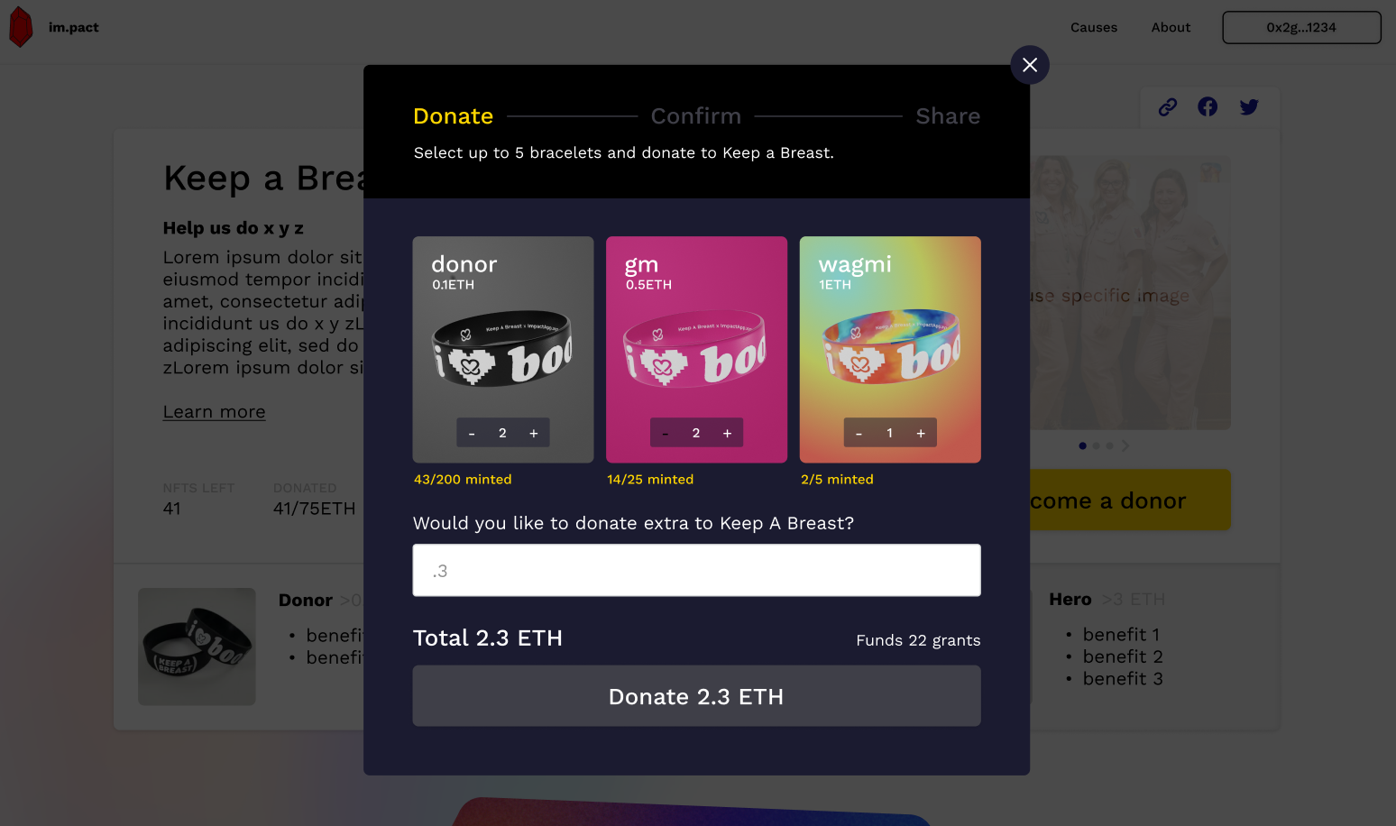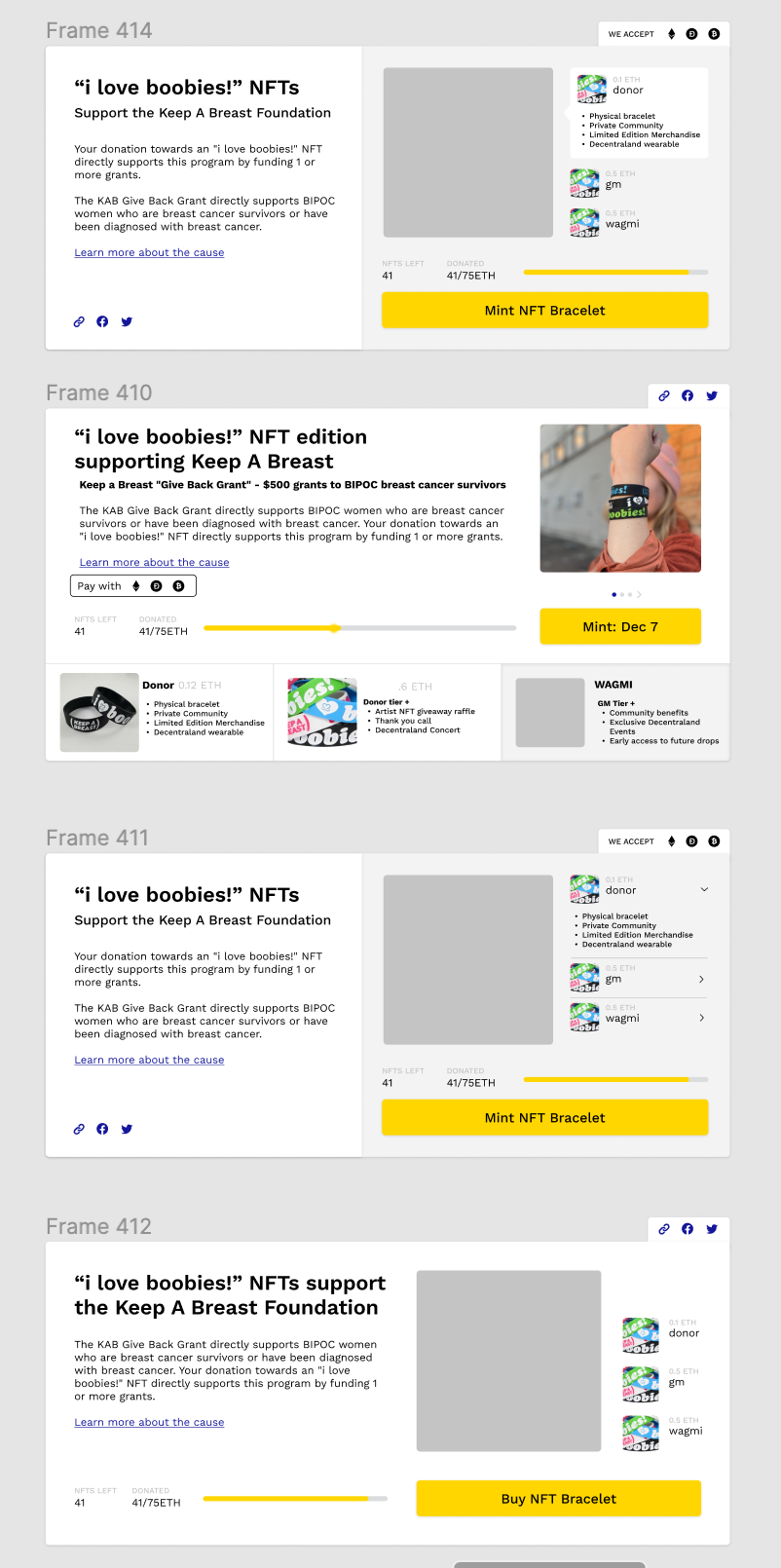 Every component was the result of iterations and trials. A simple example: there was a lot of information we had to condense in the main donation card: information about each donor tier, the charity and cause being supported, the cryptocurrencies accepted, share modals, etc., and the information hierarchy was something we played around with a lot. I also worked with the devs to create A/B tests that helped us understand what modals performed better and led to better donor conversion rates.