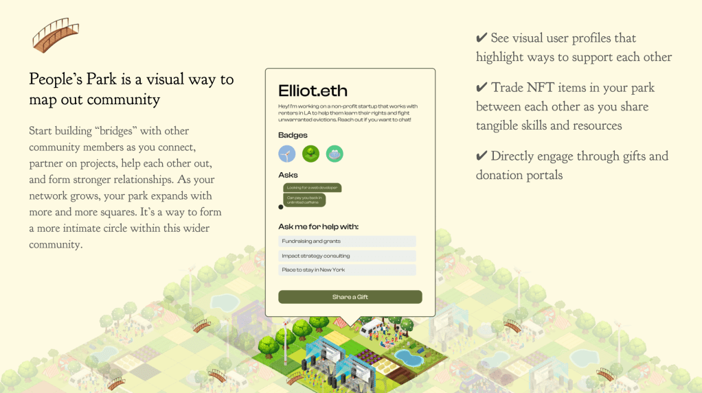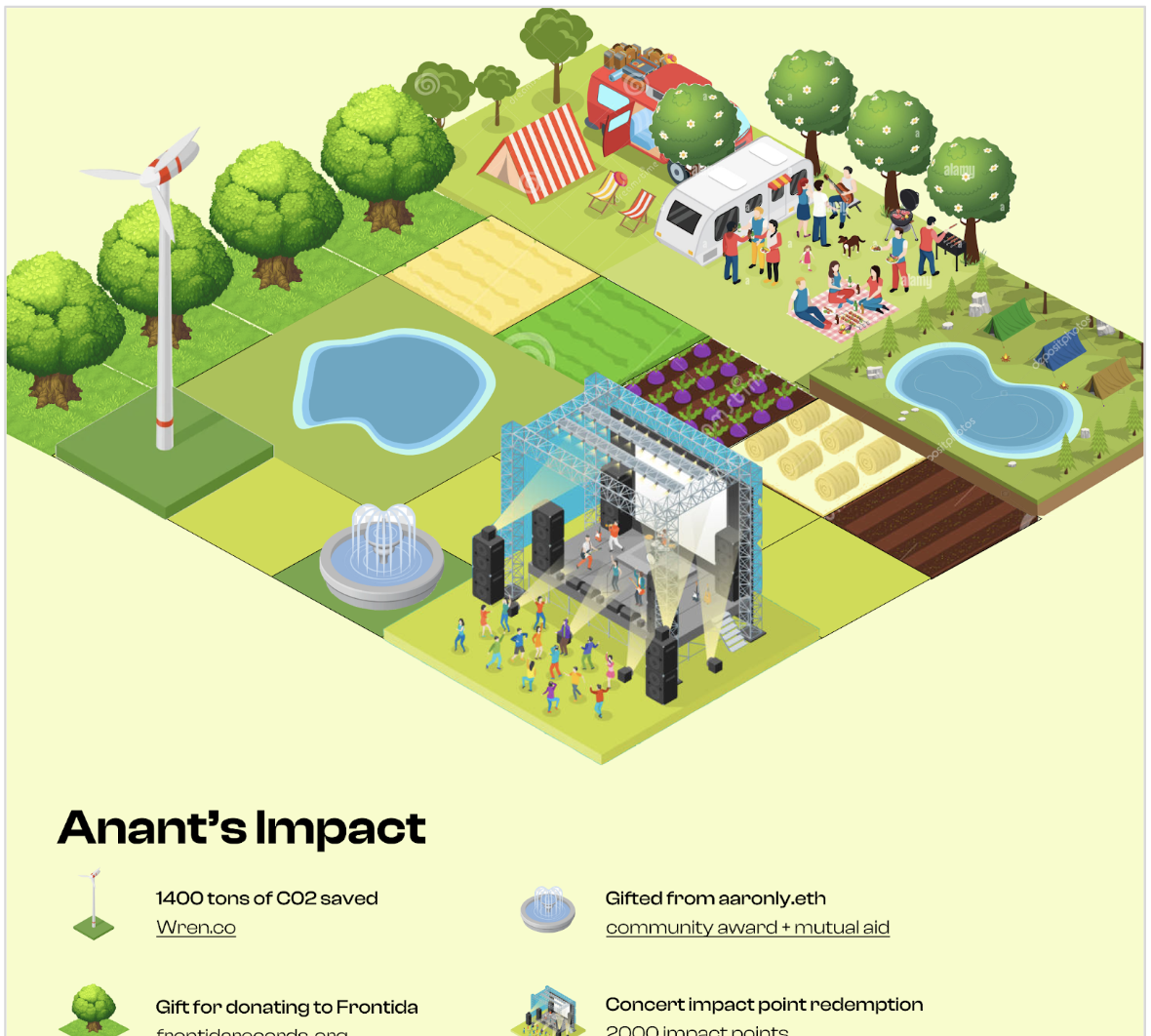 Envisioning a world where on-chain philanthropy became more normal, I probed into how impact labs could be a hub for encouraging longer-term, engaging donor experiences. What if donors could earn impact NFTs with every cause they supported that could be showcased in their garden? By gamifying the experience of impact-making, people can begin accumulating impact, showing off the causes they support, and creating a visual guide to one’s cumulative real-world impact. Partnering with causes like carbon offset subscriptions like Wren or other recurring donation models provides an interesting way to “grow” evolving items that change as active subscriptions contribute to impact.